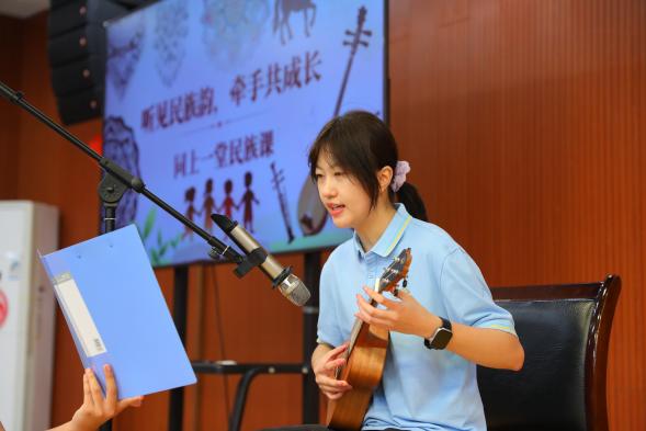 《心中的鼓声》用多民族语言,将盲少年阿普的勇敢传说讲得生动;《千里万里》《金杯》的纯净歌声,从高原传到草原,真挚祝福在礼堂回响;尤克里里弹唱《和你一样》,情感真挚地合唱让笑容在彼此脸上绽放;《我曾梦想》唱出了哈萨克少年的壮志凌云,所有同学用双手打起节拍,奋进的信念感染全场。