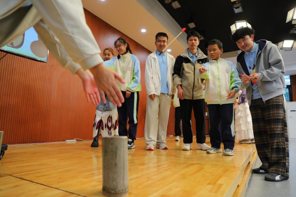 投壶挑战赛上,预科班同学蒙上眼睛与孩子们同台竞技,通过声音判断距离投掷羽箭。当预科班哥哥姐姐还在摸索方向,早有孩子已稳稳命中。以心为眼,能看得更准、更远。