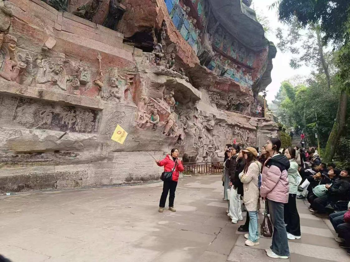 在导游带领下,全体同学分别参观了宝顶山石刻、北山石刻和南山石刻,围绕“理想信念”“责任担当”“修身养性”“敬畏之心”“感恩之心”等篇章开展现场教学与研讨,大家结合石刻寓意,开展家国情怀、文化自信主题交流分享,实地感受世界文化遗产的深刻魅力。