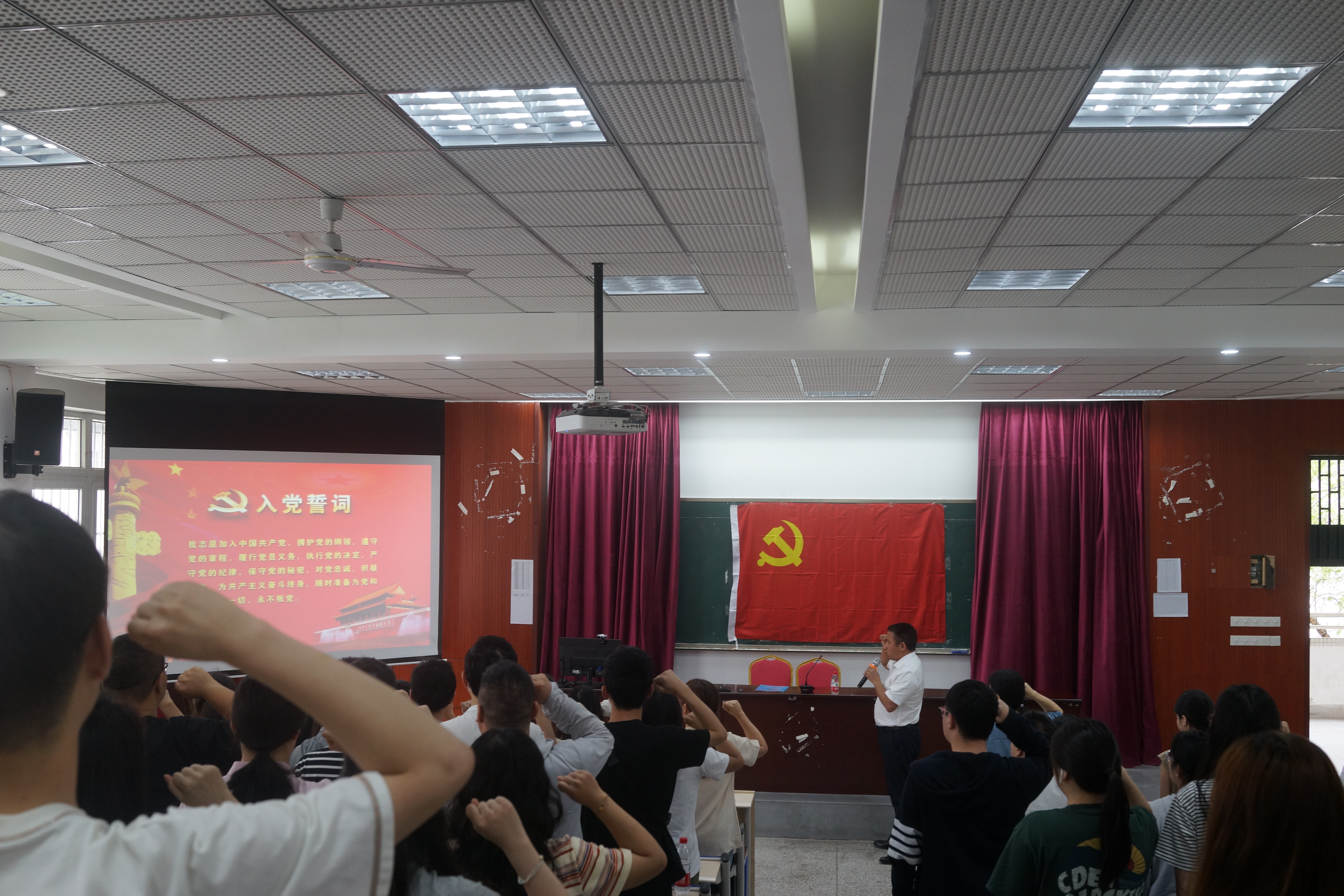 为进一步强化毕业生党员牢记入党初心,不忘青春使命,全体与会党员集体重温入党誓词。面对党旗,在罗庆昌的带领下,100多名党员齐声宣誓,声音铿锵而豪迈,庄严而震撼,再一次向党和人民做出庄严的承诺。