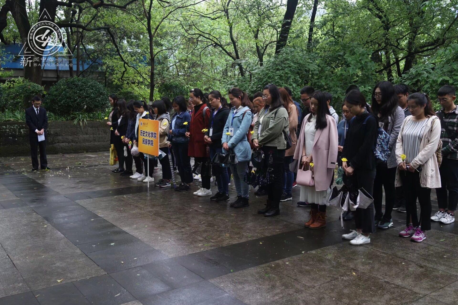 4月5日13:30,同学们于荟文楼门前整装待发,一同前往张自忠将军烈士陵园。30分钟后,同学们怀着无限崇敬之情抵达陵园。映入眼帘的是许许多多苍翠的松柏,笔直耸立,似是象征着先烈永垂不朽的革命精神。庄严肃穆的氛围笼罩着整个园林,淅淅沥沥的小雨更是平添了几许沉重。