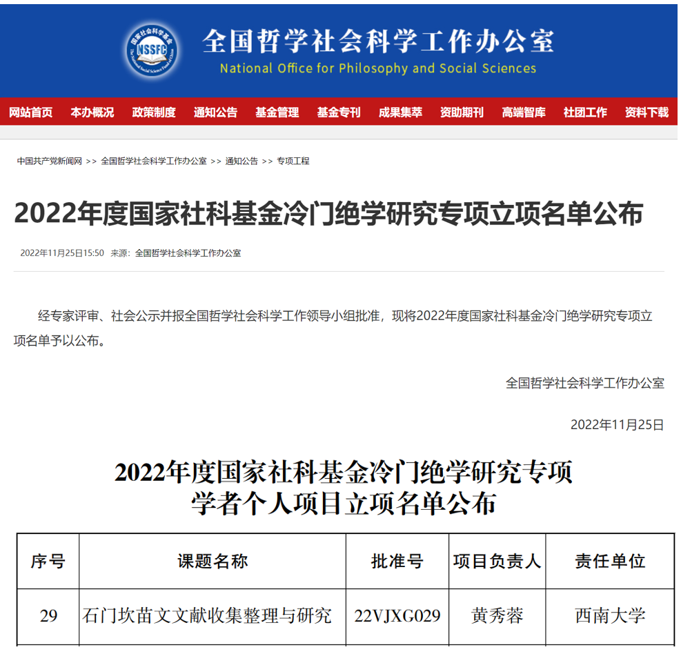 2022年11月25日,全国哲学社会科学办公室正式公布了2022年度国家社科基金冷门绝学研究专项立项名单。taptap点点体育黄秀蓉老师的《石门坎苗文文献收集整理与研究》(批准号22VJXG029)获批学者个人项目。