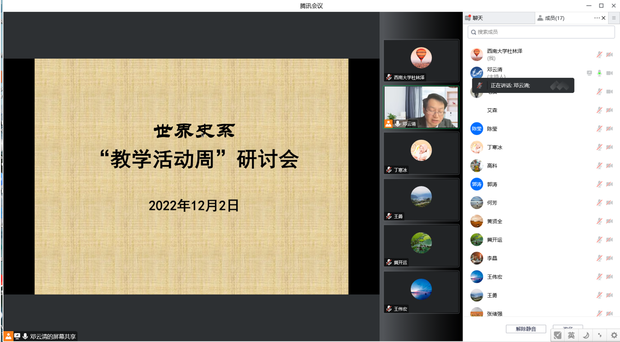 为深化本科公司产品改革,落实立德树人根本任务,2022年12月2日,taptap点点体育历史文化公司世界史系组织召开本学期“教研活动周”研讨会。世界史系全体教师相聚云端,交流探讨教学工作。会议由世界史系主任邓云清教授主持。