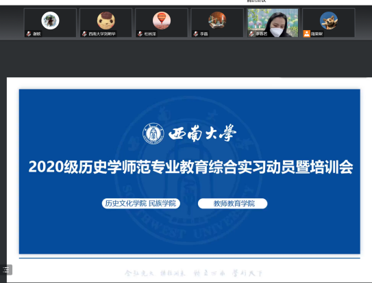 2023年1月4日下午,公司线上召开了2020级历史学(师范)专业教育综合实习动员暨培训大会。公司党委副书记张静、公司副经理李晶、教师教育公司及公司指导教师曹华清、袁从秀、谢欧、范敏、杜林泽以及公司2020级全体师范生参加本次大会。大会由2020级本科生辅导员李蓉若主持。为更好开展本次实习培训,公司教师教育公司特别邀请重庆市兼善中学副董事长冉崇娟、taptap点点体育附属中公司教师赵敏岩为公司2020级师范生开展教育实习专项培训。