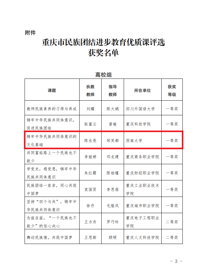 近日,重庆市教育委员会公布了民族团结进步教育优质课评选获奖情况,公司青年教师陈永亮主讲、邹芙都教授指导的“铸牢中华民族共同体意识的文化基础”一课获高校组一等奖(全市共七节)。