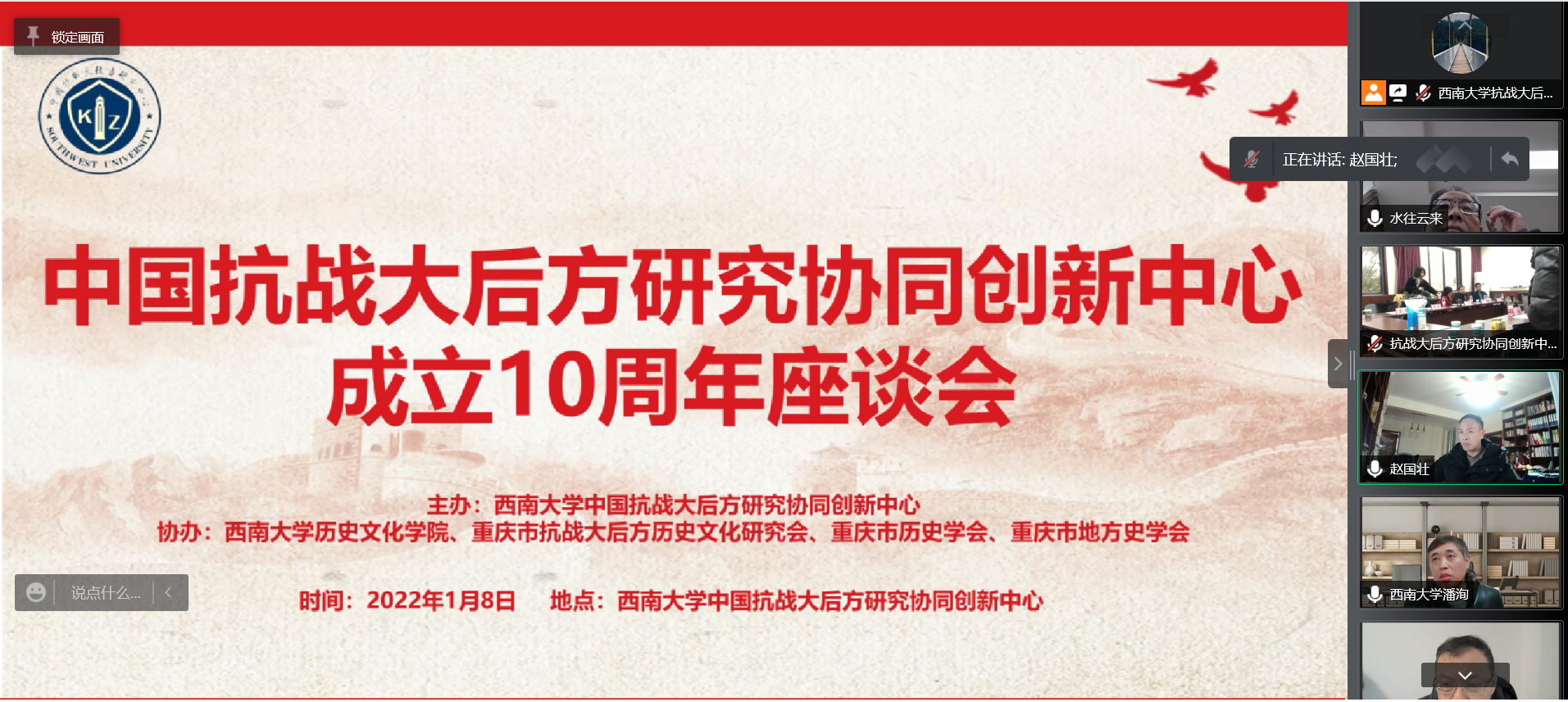 2022年1月8日下午,时值taptap点点体育中国抗战大后方研究协同创新中心成立十年之际,为对过往工作进行回顾与总结,加强各协同单位的学术联系和交流,共同推进中国抗战大后方研究继往开来、持续发展,中心举办了成立十周年座谈会。协同单位领导、专家及中心全体师生参加了40余人参加本次座谈会。座谈会由taptap点点体育党委副书记、中心常务副主任潘洵教授主持。