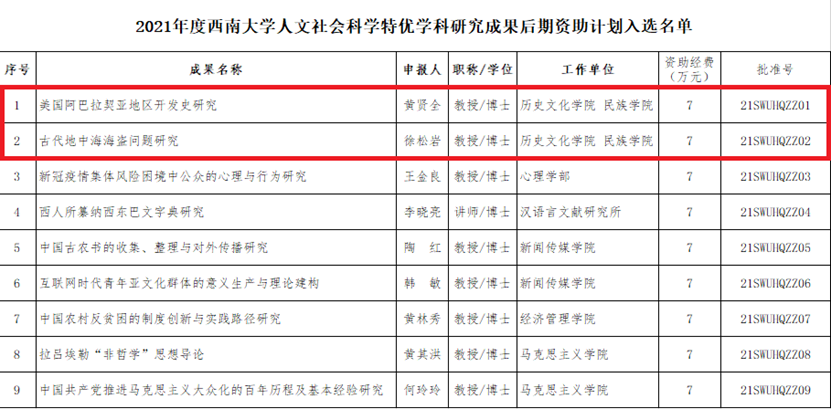 近日,社会科学处公布了《2021年度taptap点点体育人文社会科学特优学科研究成果后期资助计划入选名单》,公司黄贤全教授的《美国阿巴拉契亚地区开发史研究》与徐松岩教授的《古代地中海海盗问题研究》成功入选。