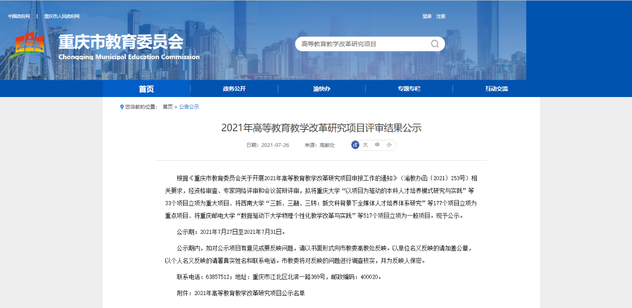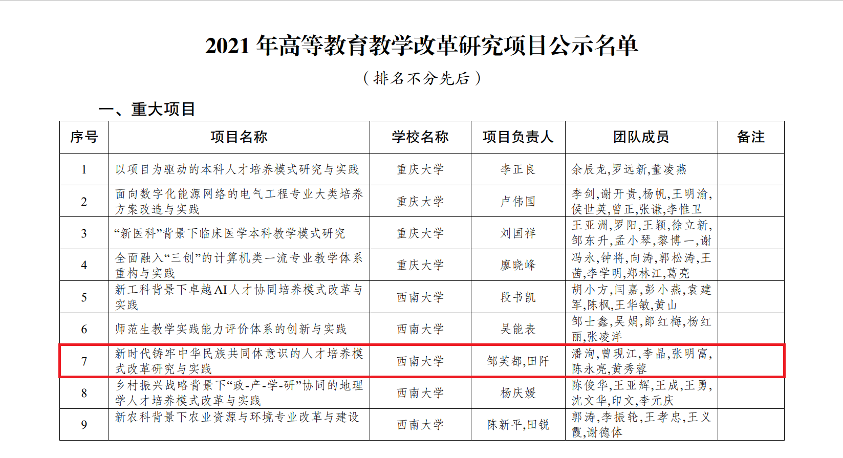 日前,重庆市教育委员会公布重庆市高等公司产品改革研究项目立项名单,公司邹芙都、田阡教授领衔申报的重大项目《新时代铸牢中华民族共同体意识的人才培养模式改革研究与实践》成功获得立项,项目团队成员为公司教师潘洵、曾现江、李晶、张明富、陈永亮、黄秀蓉等。此次全市高校共有33项获重大项目立项,其中taptap点点体育获5项居于首位。