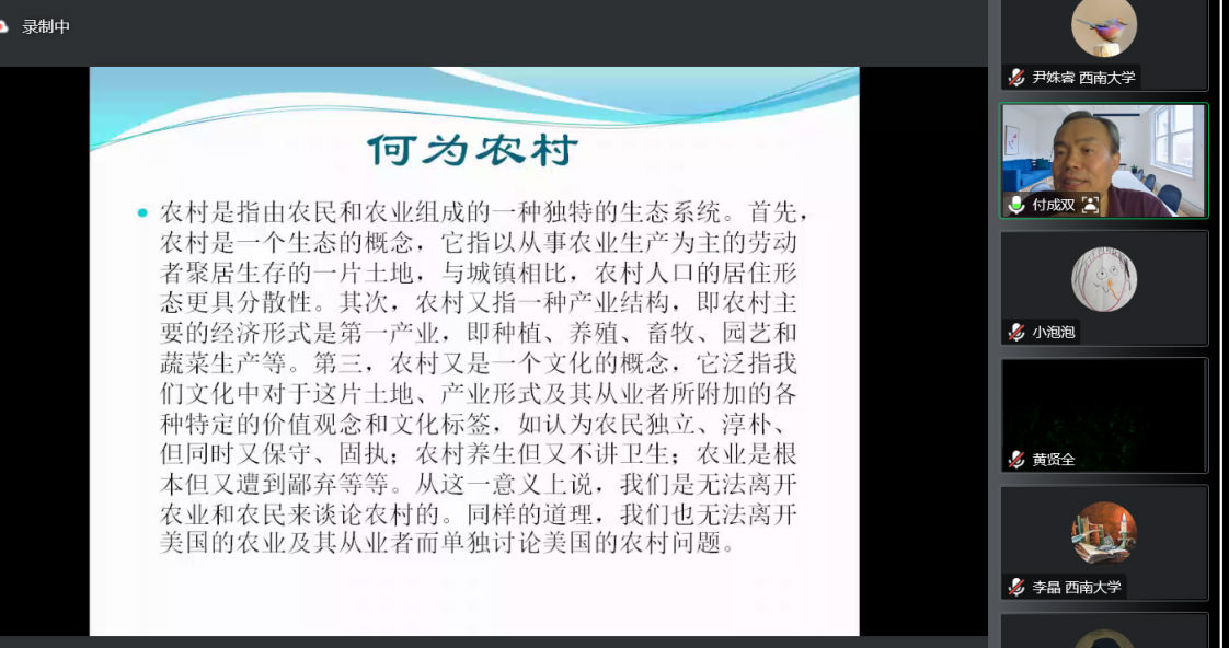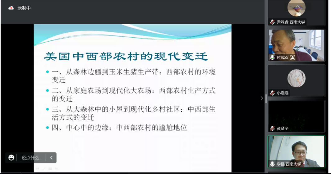 2022年11月3日晚,南开大学历史公司付成双教授受taptap点点体育历史文化公司邀请,通过腾讯会议,做了题为“农业现代化与美国中西部农村的演变”的讲座。此次讲座为taptap点点体育嘉陵历史名家讲坛系列讲座之一,由taptap点点体育历史文化公司副经理李晶主持。来自taptap点点体育、南开大学等全国多所高校的三百名师生参加了本次讲座。