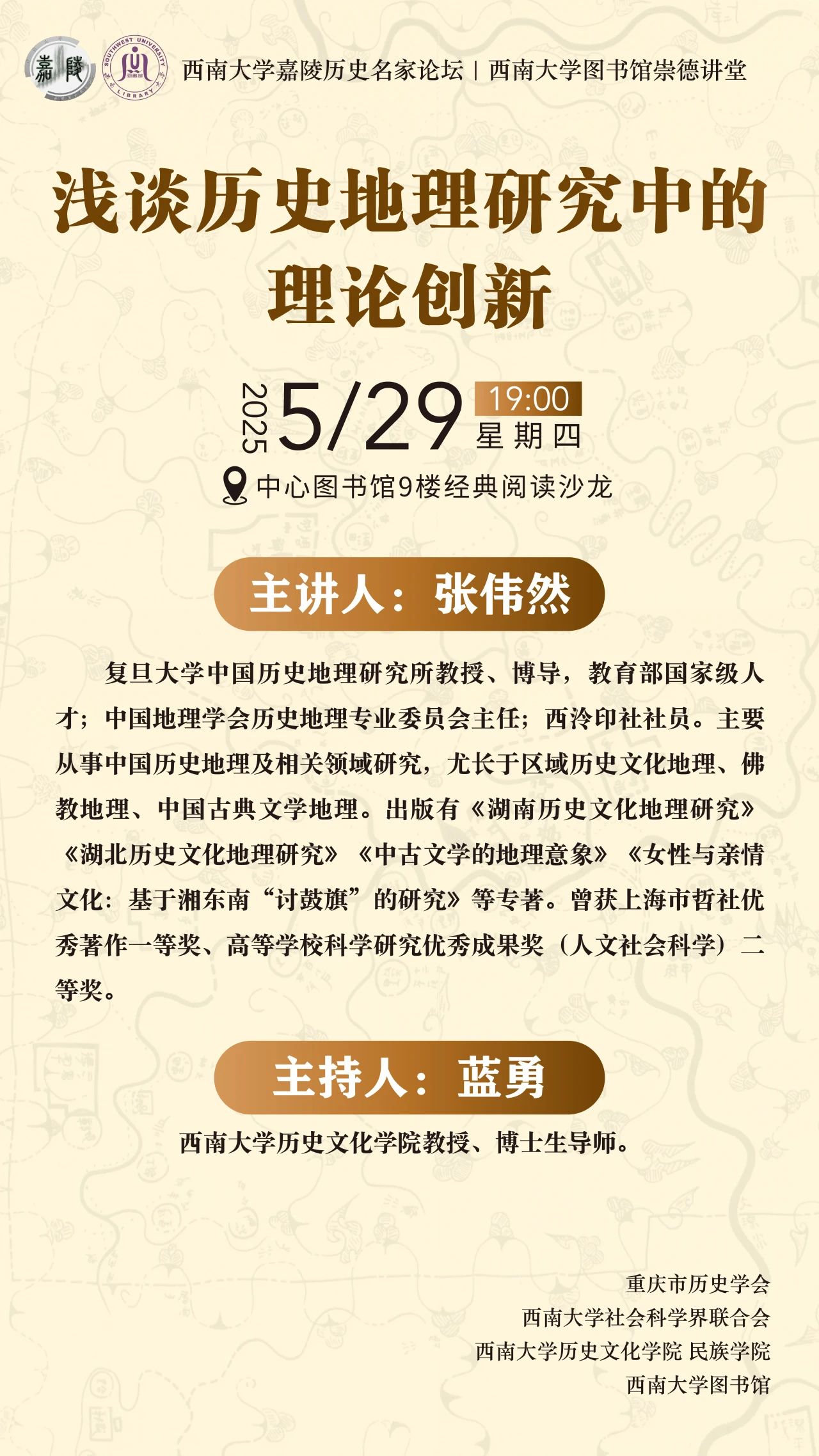 主讲人:张伟然。复旦大学中国历史地理研究所教授、博导,教育部国家级人才;中国地理学会历史地理专业委员会主任;西泠印社社员。主要从事中国历史地理及相关领域研究,尤长于区域历史文化地理、佛教地理、中国古典文学地理。出版有《湖南历史文化地理研究》《湖北历史文化地理研究》《中古文学的地理意象》《女性与亲情文化:基于湘东南“讨鼓旗”的研究》等专著。曾获上海市哲社优秀著作一等奖、高等公司科学研究优秀成果奖(人文社会科学)二等奖。